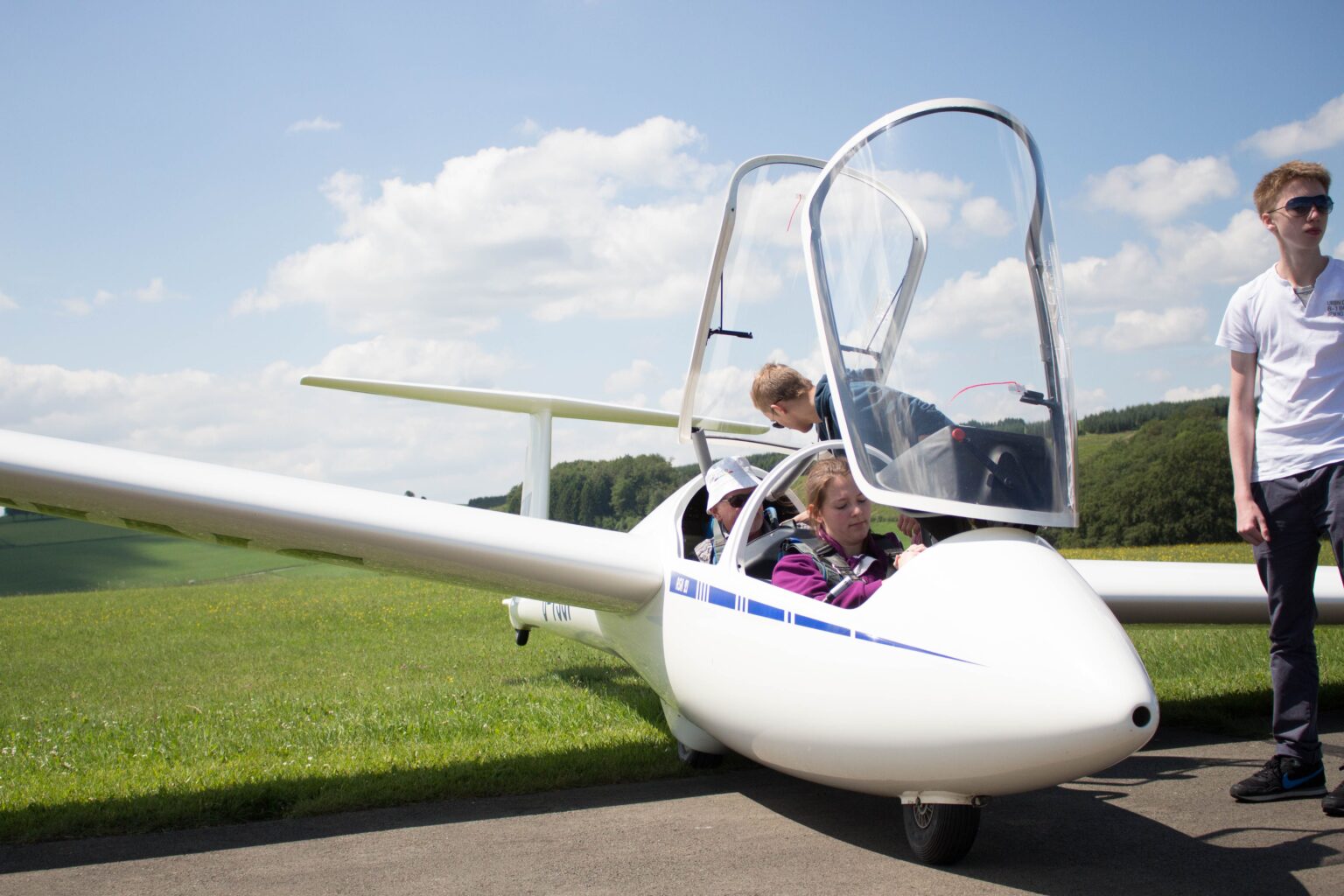 • Erste Flüge mit Fluglehrer: Du beginnst im doppelsitzigen Segelflugzeug. Du sitzt vorne, dein Fluglehrer hinten. Anfangs übernimmt er die meisten Aufgaben, sodass du dich an das Gefühl des Fliegens gewöhnen kannst. In der Luft zeigt er dir die Steuerung des Flugzeugs, und du kannst die Übungen unter seiner Anleitung nachfliegen.